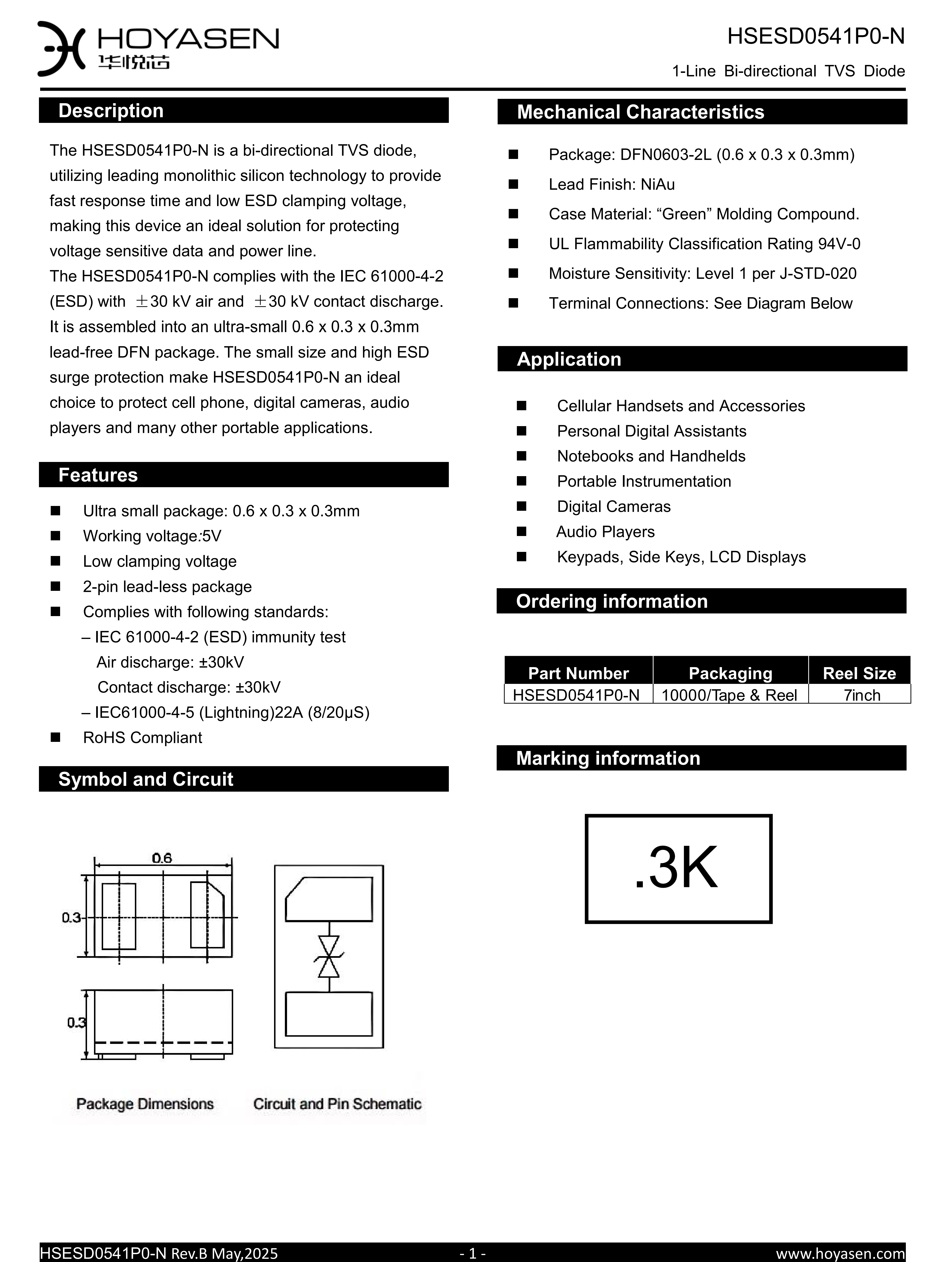 The Huayue Core HSESD0541P0-N device, a bidirectional TVS, is packaged in a DFN0603 (0201) package. With a maximum operating voltage of 5V, it requires minimal space to support an IPP up to 22A, with a typical clamping voltage of 9V. This solution supports electrostatic discharge testing up to 30KV, and its low clamping voltage ensures superior surge and electrostatic protection. The device's junction capacitance is typically 30pF, meeting most requirements for DC ports and low-to-medium frequency communication applications.